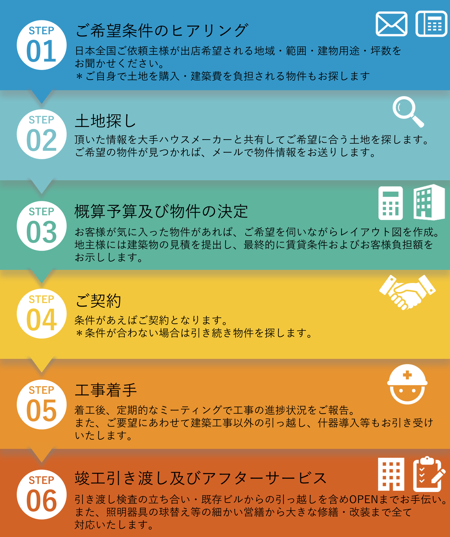 建築総合プロデュースの弊社なら、土地・物件探しはもちろん、設計・建築・開店サポート・改装・建物維持管理まで、開業に必要な全ての業者をワンストップで手配・監理いたしますので、忙しい方や初めて開業される方におすすめです。